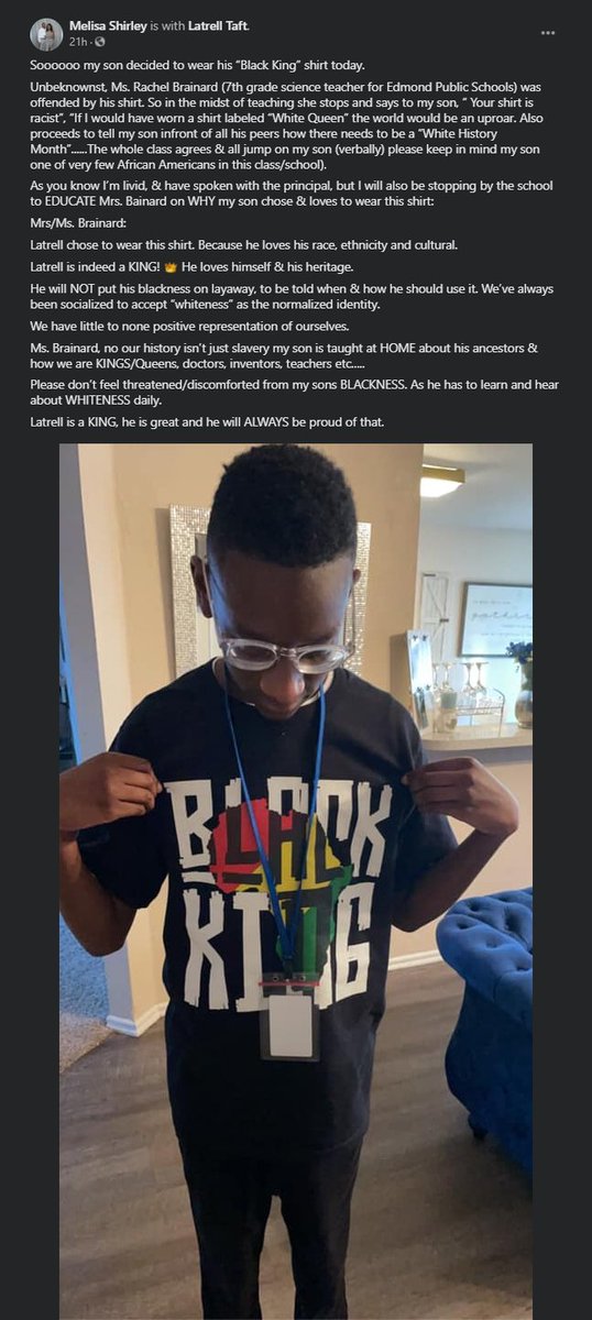 Taft proudly wore a t-shirt depicting the words “Black King” emblazoned with a colorful print of Africa to Heartland Middle School in Edmond, Oklahoma. When he got to his seventh-grade science class, however, his teacher didn’t find the message as positive as he did.